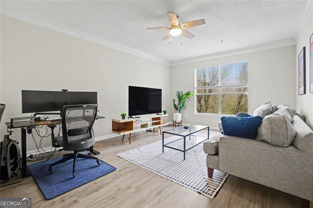 Top-floor condo in Brookhaven's Villa Sonoma at Perimeter Summit. This 1-bedroom, 1-bath home features an updated kitchen with stainless steel appliances, granite counters, white cabinetry, and a breakfast bar. Open floor plan with crown molding, LVP flooring throughout, and modern lighting including track lights and a statement dining fixture. Glass block window adds architectural interest. Spacious living area with ceiling fan and natural light. Bedroom includes a walk-in closet and ceiling fan. Updated bathroom with granite vanity. Community amenities include a resort-style pool, full fitness center with cardio and weight equipment, and green space with outdoor seating. Prime Perimeter location near shopping, dining, and major interstates. HOA includes water, sewer, trash, exterior maintenance, and access to all amenities.