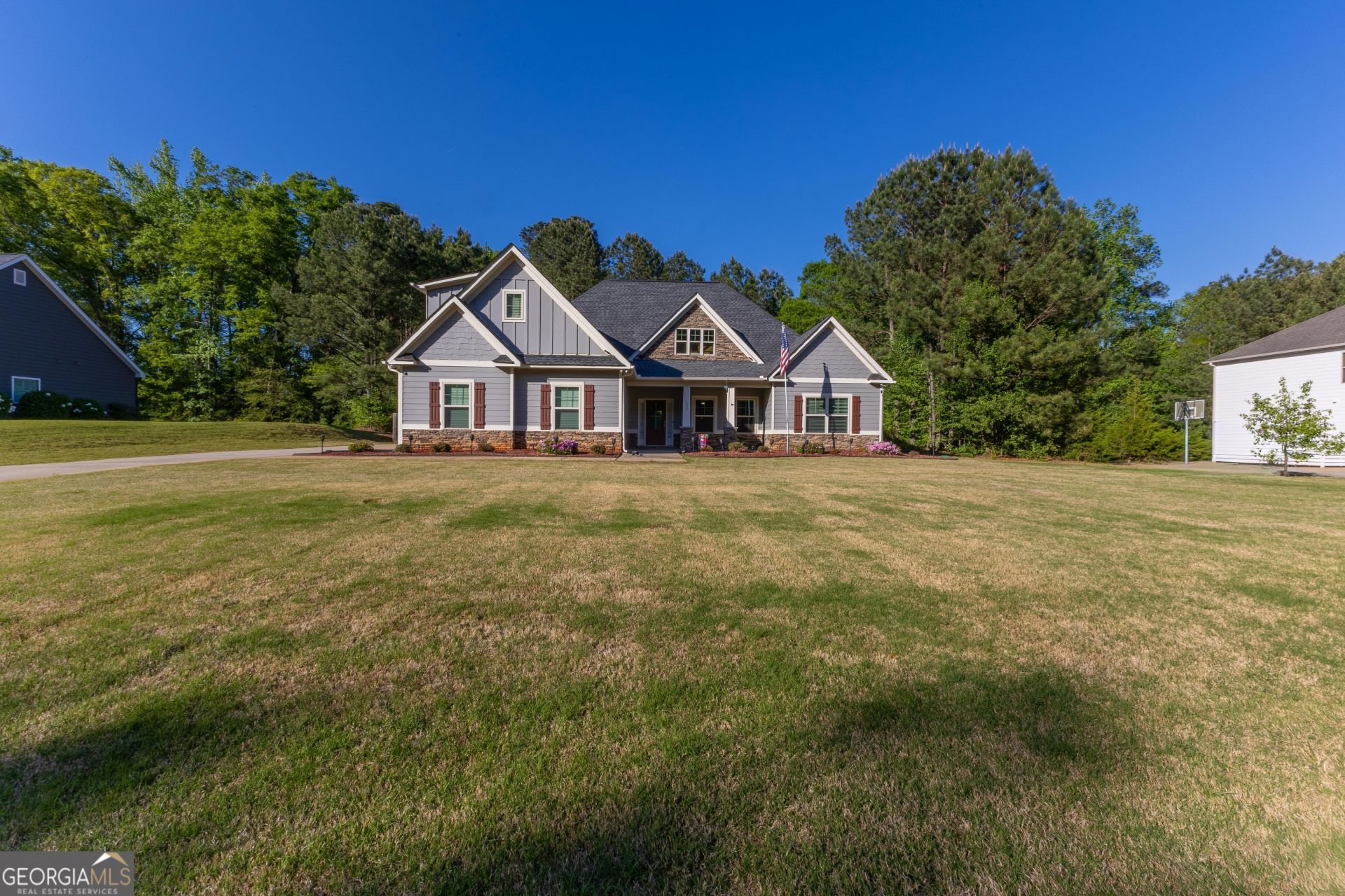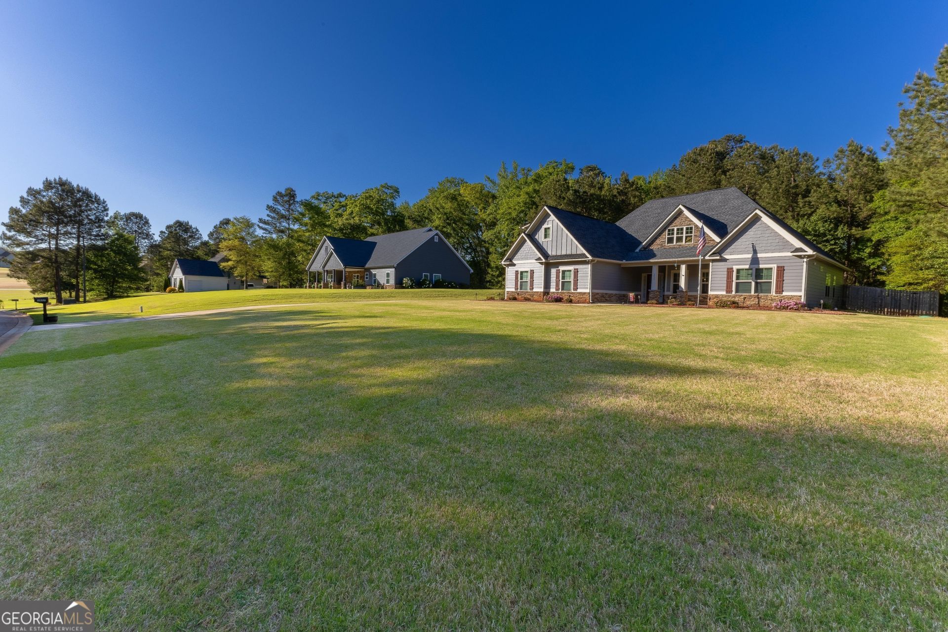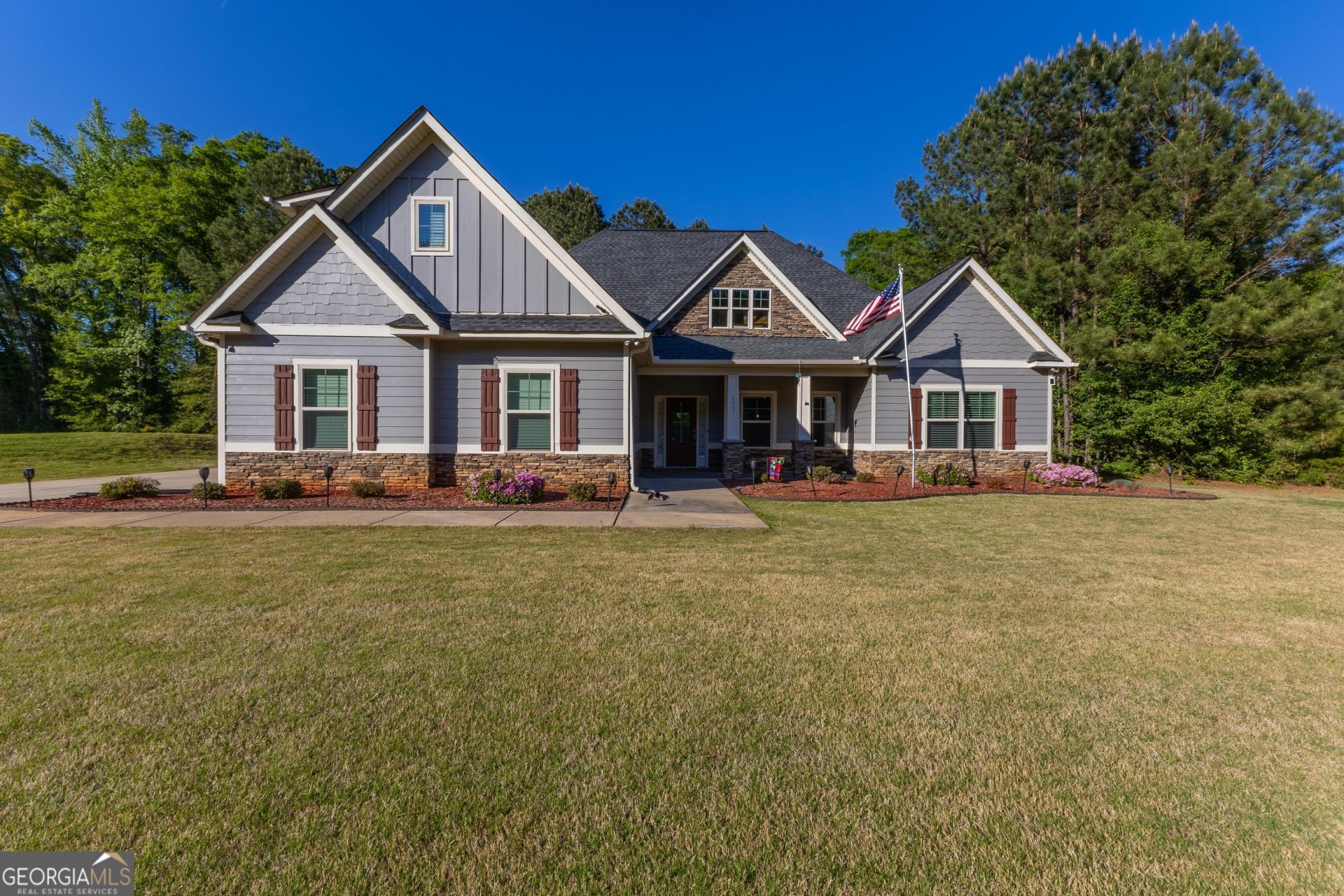 Welcome to the stunning Ashley Glen Subdivision in Williamson, where you can truly enjoy the good life in this magnificent Craftsman Style Home. This meticulously maintained property is situated on the last street of the community, offering privacy and no traffic. The open floor plan showcases all the beloved Craftsman features, including beautiful hardwood floors, granite countertops, and tile baths. Upon entering the foyer, you're greeted by a spacious family room featuring a charming wood-burning fireplace with a brick hearth. The dining room flows seamlessly into the kitchen, which is open to both the breakfast room and a generous keeping room, providing ample space for family gatherings. Step outside to the covered patio, complete with a fireplace, which leads to a vast, fenced-in backyard with an outbuilding. The garage entry introduces a mudroom and a sizable laundry room. The primary suite, located on the main floor, is oversized and includes a luxurious primary bath with a jetted tub, water closet, separate shower, and walk-in closet. Two additional bedrooms on the opposite side of the home offer spacious accommodations with ample closet space. The fourth bedroom, situated on the second floor, is ideal for a teen suite with its private bath. The exterior of this home has been freshly painted, enhancing its overall appeal. You really don't want to miss touring this wonderful home.