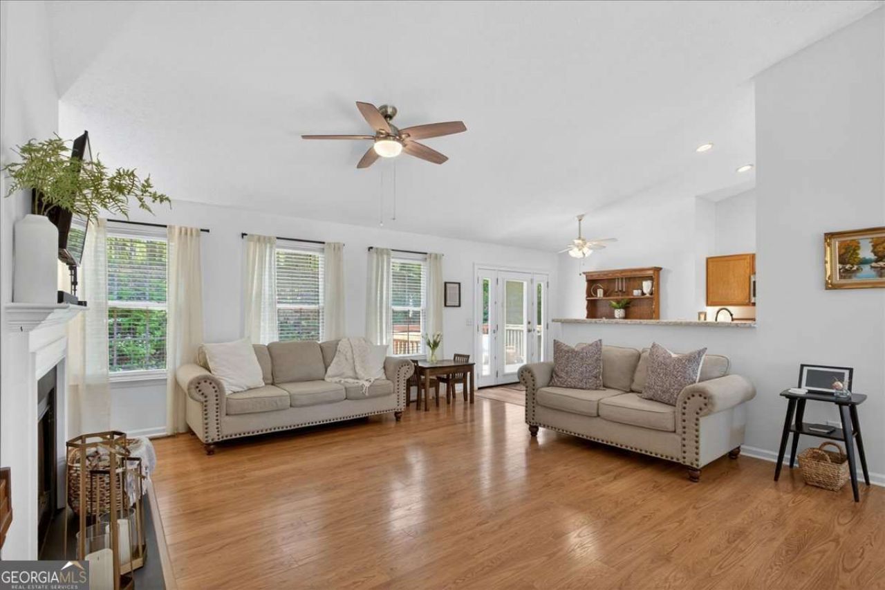 Tucked away in a quiet, established Woodstock neighborhood, this beautiful split-level home welcomes you with a sense of warmth and comfort from the moment you arrive. As you step inside, you're immediately drawn upstairs to the main living area, where natural light pours in through a stunning wall of windows, highlighting the soaring vaulted ceilings and creating an airy, inviting atmosphere. The living room is the heart of the home, anchored by a cozy fireplace-perfect for relaxing evenings or gathering with friends and family. From there, the space flows effortlessly into the dining area and galley-style kitchen, offering a seamless open-concept design that makes both everyday living and entertaining feel easy and connected. Whether hosting a dinner party or enjoying a quiet night in, this layout truly brings people together. The thoughtfully designed roommate floor plan provides both comfort and privacy. The spacious primary suite feels like a retreat of its own, featuring a beautifully appointed ensuite bath with double vanities, a soaking tub, separate shower, and a large walk-in closet-creating the perfect place to unwind at the end of the day. On the opposite side of the home, two well-sized secondary bedrooms share a full bath, offering flexibility for family, guests, or a home office setup. Convenience continues with a generously sized laundry room located on the main level, making daily routines that much easier. Downstairs, a versatile and expansive bonus space opens up endless possibilities. Complete with its own bedroom, bathroom, and private access to the backyard, this area is ideal for an in-law suite, teen retreat, guest quarters, or even a home office or media room-tailored to fit your lifestyle. With its blend of natural light, functional layout, and flexible living spaces, this home offers the perfect backdrop for both everyday living and special moments alike. Located in the heart of Woodstock, close to shopping, dining, and everything the area has to offer, this is one you don't want to miss. Schedule your private showing today and experience it for yourself.