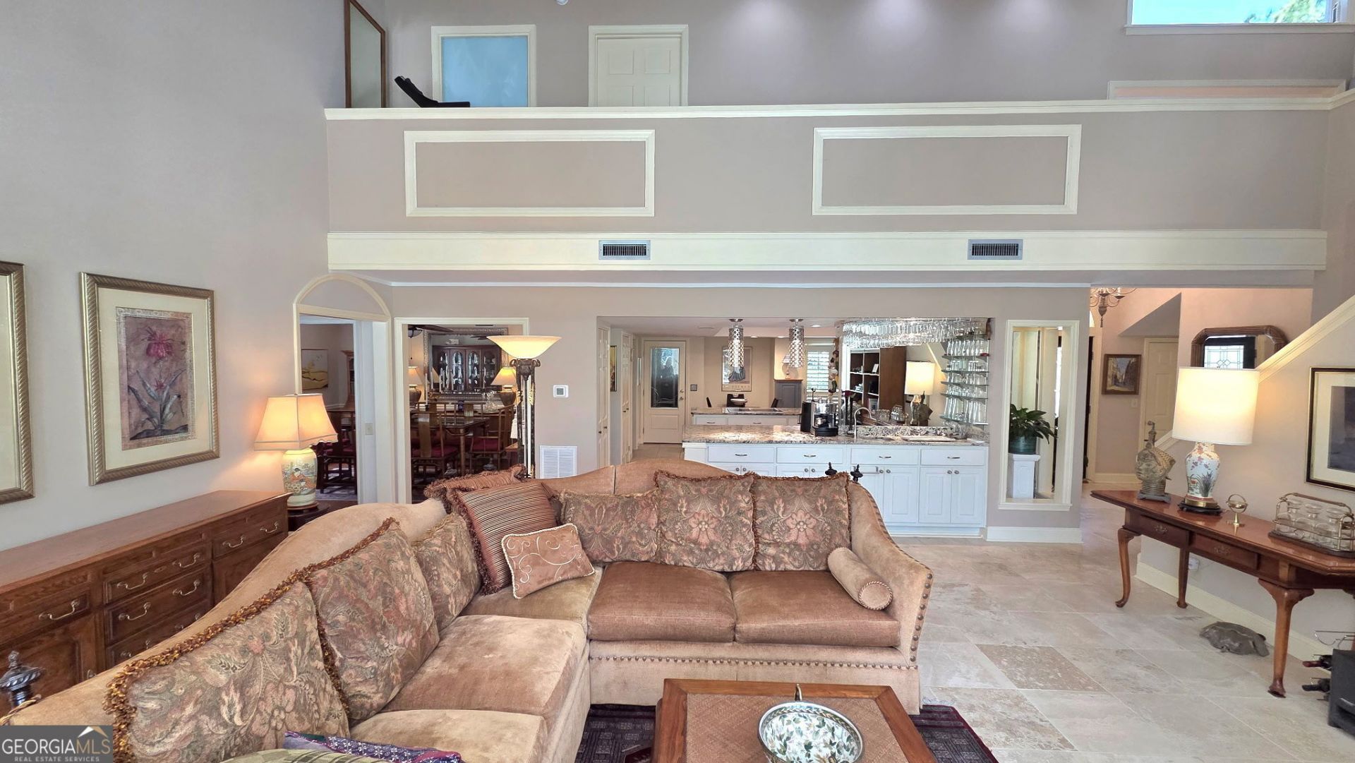 Elegant custom built home in the sought after Sea Palms golf community. This island classic contemporary features high vaulted ceilings in the sunroom and great room. Panoramic floor to ceiling south facing windows provide lots of sunlight and nature views. Open concept kitchen, great room, and sunroom with travertine flooring. Step down family room with vaulted tongue & groove stained ceiling, exposed beams and a brick fireplace. The stunning kitchen has a gorgeous cooktop island, granite countertops, stainless appliances, and double pantries. This home features two en-suites plus an additional guest bedroom with adjacent bath. The primary bedroom has a vaulted ceiling, private balcony and a his/her layout with separate dressing area and separate vanities and a skylight. This large, private lot is beautifully landscaped with topical plants and has room for a pool.