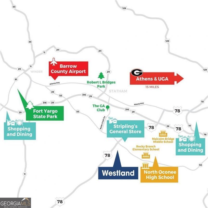 NEW CONSTRUCTION, 3-SIDED BRICK, PRIMARY BEDROOM ON MAIN, home located in a highly sought-after school district in North Oconee County. Westland is a beautiful new community, and Amenities include an oversized pool and cabana, pickleball courts, tennis courts, sidewalks, streetlights, and playground. BUILDER PAID CLOSING COST & RATE BUY DOWN when using their preferred lender. The Edison floorplan is a 4 bedroom, 3 full bath plus powder room two-story home. Upon entering this estate-style home, you'll find a formal dining room and the central family room with an open island kitchen that offers quartz countertops, GAS COOKTOP, DOUBLE OVENS, and stainless steel appliances. In addition to a casual dining area so everyone stays connected. The primary bedroom suite is also on the main level, located to one side of the home for privacy. The adjoining spa-like bath includes a garden tub, separate shower and dual vanities, plus there is an oversized closet. Upstairs boasts a huge second living room ideal for recreation, movie nights and gaming. Three spacious secondary bedrooms include generous closets and there are two full baths to ensure everyone has their own space. All homes include IRRIGATION. Conveniently located on Hwy 78 & Hwy 53, just minutes from 316, schools, shopping, parks, the University of Georgia, downtown Athens, and so much more! Stop by for a tour and walk the completed homes! You won't be disappointed! PHOTOS ARE FOR ILLUSTRATIVE PURPOSES AS THIS HOME IS CURRENTLY UNDER CONSTRUCTION. ESTIMATED COMPLETION IS JUNE. Stop by for a tour and walk the completed homes! You won't be disappointed!