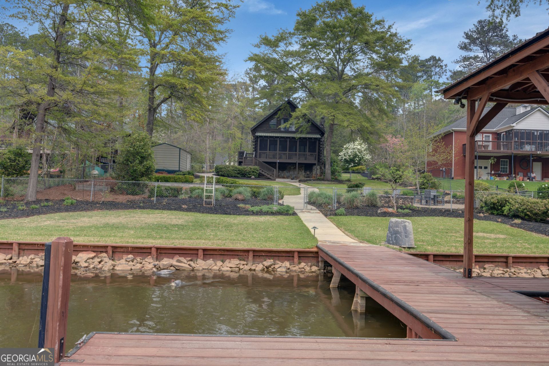 Deeded waterfront 4-bedroom & 2-bathroom renovated log home and is absolutely stunning inside & out! Decorated by an award-winning designer, this home is turnkey ready & is coming fully furnished including the beautiful sunsets. The main floor includes 2 bedrooms, guest bathroom, living room with a custom stone fireplace, dining room & kitchen. Other features of this Smart Home include upgraded doors and door hardware throughout, upgraded kitchen & dining room lighting, guest bathroom is updated with a custom tile tub with glass shower door, upgraded plumbing fixtures, upgraded vanity & linen closet, upgraded lighting fixtures & ventilation, custom painted kitchen cabinets, stainless steel appliances(all appliance are staying including the washer & dryer) and nest thermostat with + 2 remote sensors. Upstairs includes 2 bedrooms and 1 bathroom which boast an over-sized owner's suite with sitting room and views of the lake, large walk-in closet with custom shelving, upgraded engineered wood flooring, upgraded ceiling fans & accent lighting, a separate bedroom/office and custom ensuite bathroom with tiled glass shower enclosure, upgraded vanity, plumbing fixtures, lighting and ventilation. Outdoor living upgrades include a recently replaced medal roof, screened porch with custom solar shades on all screens, 2 designer fans with LED lighting, added grill area and steps to the backyard, upgraded concrete driveway with lighted path all the way to the dock, newer rock wall beneath the front porch, custom fire-pit with seating wall & lower patio, full-yard irrigation system with dual water sources including pump from the lake, raised organic garden beds with separate dedicated irrigation, hose bibs at garden & dock, extensive underground drainage, fencing and electric sub-panel in shed to supply irrigation pump and custom lighting. The dock that has been recently re-stained with boat lift, retractable awning and upgraded seawall. Every detail has been thought of for this gorgeous log home just bring your toothbrush and start enjoying lake living! Some of the patio furniture may not be staying. Turtle cove features many amenities including a 9-hole golf course, clubhouse with full-service restaurant & bar, 5 white sand beaches some with boat ramps, & pickle-ball courts.