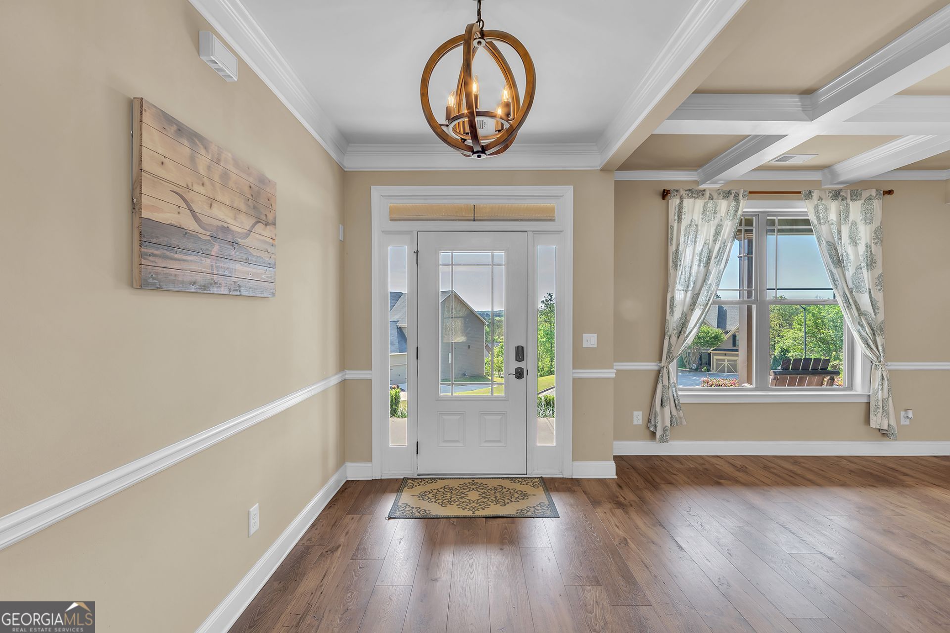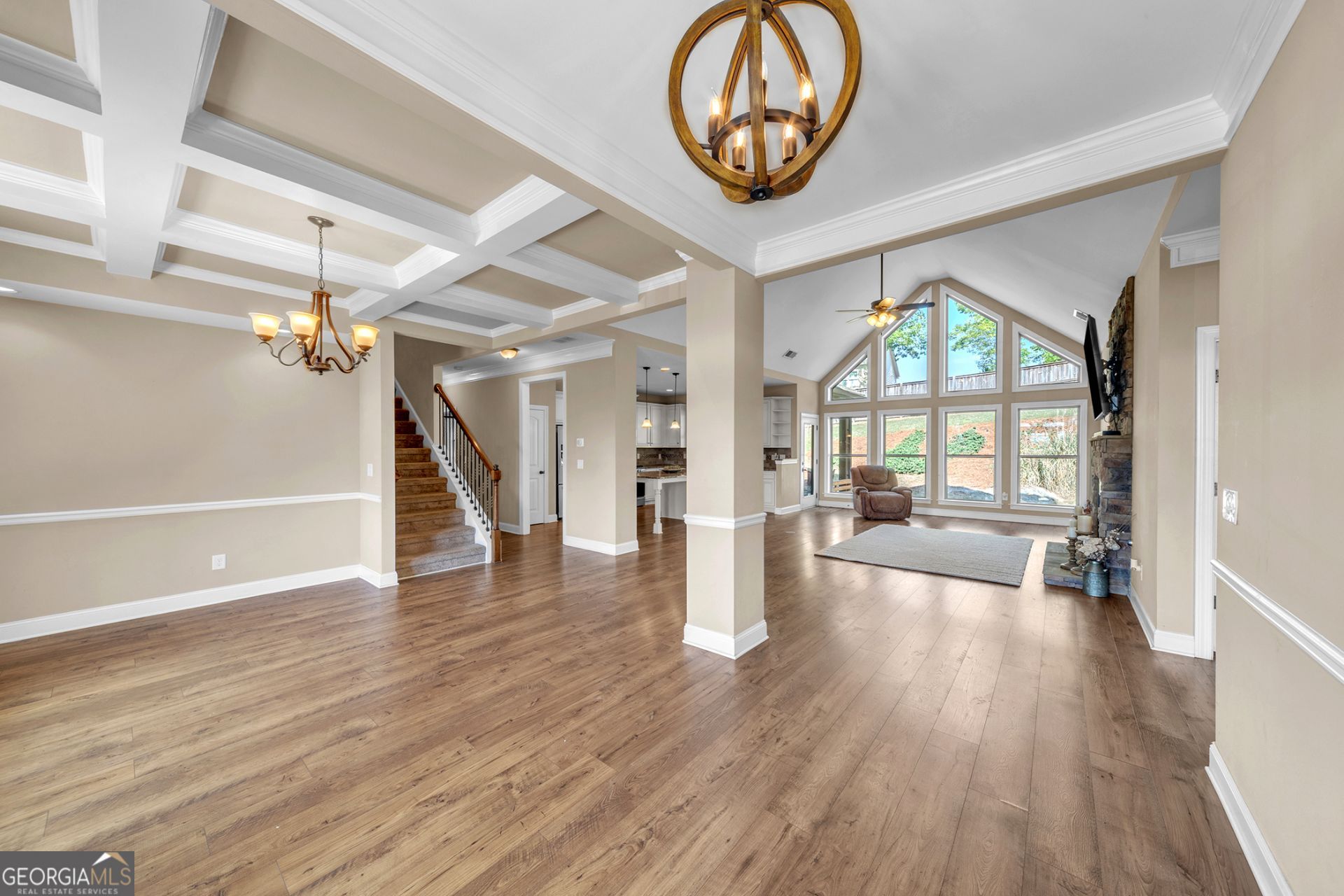 Welcome to your private retreat with breathtaking views of Kennesaw Mountain! This beautifully designed 4-bedroom, 3-bathroom open-concept ranch offers the perfect blend of comfort, style, and versatility. Step inside to a spacious, light-filled layout ideal for both everyday living and entertaining. The heart of the home features a stunning kitchen complete with granite countertops, stainless steel appliances, and seamless flow into the living and dining areas. The living room is anchored by a gorgeous stone wood-burning fireplace, creating a warm and inviting focal point. The elegant dining room showcases a coffered ceiling, adding a touch of sophistication for gatherings and special occasions. Generously sized bedrooms provide plenty of space for relaxation, while the flexible loft area offers endless possibilities-perfect as a 4th bedroom, home office, media room, or playroom. Whether you're enjoying quiet mornings or entertaining guests, the spectacular mountain views provide a serene backdrop that truly sets this home apart. This is the one you've been waiting for-style, space, and scenery all in one!