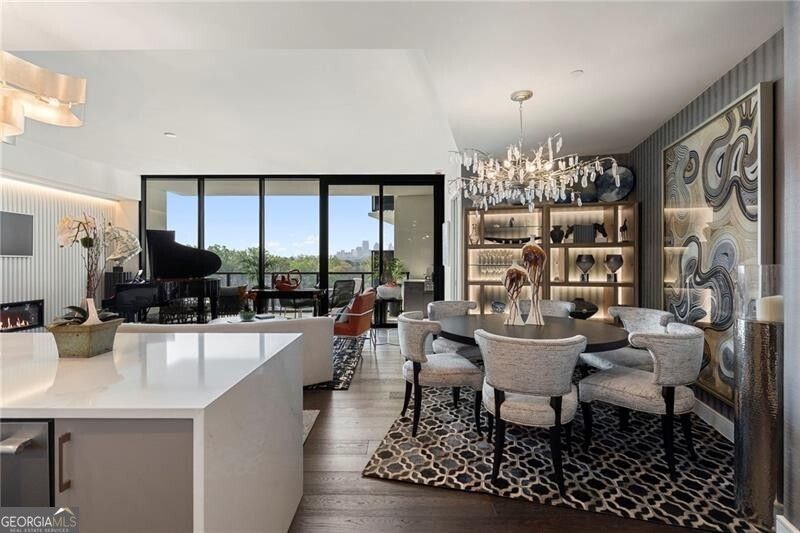 Experience elevated city living in this exquisitely upgraded 1-bedroom plus den (easy conversion to a second bedroom), 2-bath residence at The Dillon, Atlanta's premier luxury condominium. Featuring soaring ceilings and floor-to-ceiling windows with breathtaking skyline views, this home is enhanced with high-end finishes throughout, including custom Palmetto Road hardwood floors, designer chandeliers, and a sleek slimline fireplace. Thoughtfully reconfigured by the current owner, the layout offers a custom bar with built-in wine/beverage cooler, five pocket doors, and a redesigned den entry for improved flow and functionality. The spacious primary suite includes a custom walk-in closet, bespoke drapery, and a built-in office nook. Spa-inspired bathrooms feature marble vanities, designer lighting, and premium Grohe fixtures. Additional upgrades include a fully customized laundry room with built-in storage, wallpaper accents, upgraded lighting with dimmers, and LED accent lighting throughout. Building amenities including; a resort-style pool, spa, private cabanas, Atlanta's first elevated pickleball court, fenced dog park with washing stations, fitness center, club room, theatre, work hub with office suites, speakeasy lounge for residents, game room with sports simulator, and much more! Conveniently located adjacent to the Peachtree Battle Shopping Center offering Publix, Retail Shopping, and a variety of Dining restaurants. Short stroll to the Atlanta Beltline! This is luxury redefined-where modern design, upscale finishes, and iconic views come together in perfect harmony.