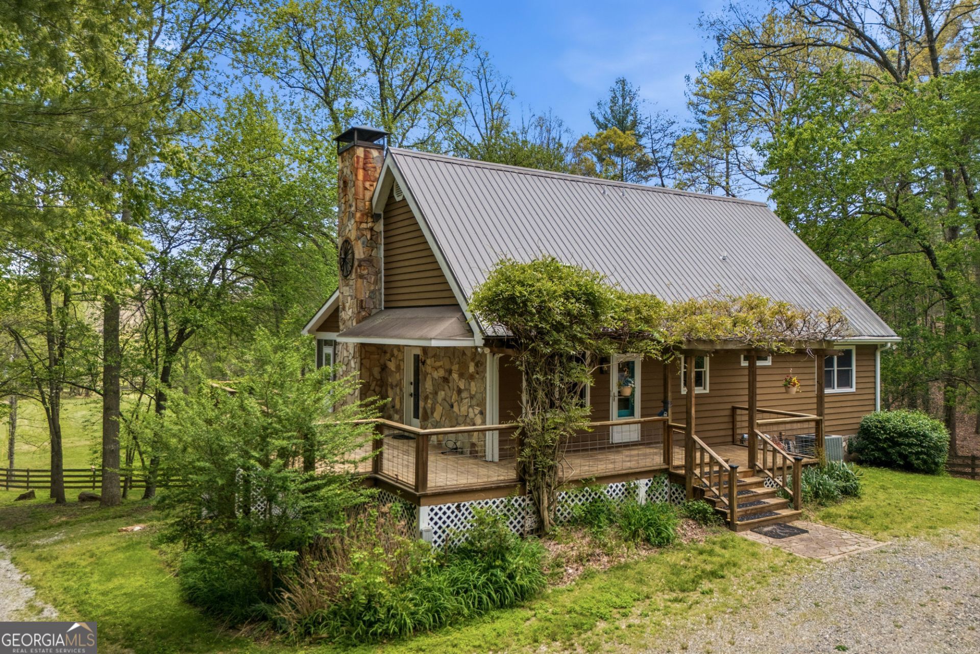 Private Unrestricted, fully fenced and gated 8.17-acre mini-farm featuring level, gently sloping pastures & paddocks-perfect for horses in Young Harris. The property includes a pond, stream, garden area, and multiple outbuildings such as a barn, tack room, and attached greenhouse. The tall pole barn offers RV, boat, or equipment storage. The beautifully renovated three-level home sits at the center of the property with 2 bedrooms on main level and 3 bathrooms. Primary bathroom features heated tile floors. The home includes a loft area as well as a bedroom with a closet downstairs for additional sleeping/living areas. County Public Records states 2,996 heated square feet. Enter the home through a wisteria-covered front entrance to an inviting great room with a masonry fireplace and a large porch overlooking the pond and peaceful pasture views where deer are often seen. The home also features a gorgeous flagstone patio in the yard, and an outdoor stone shower on the main deck. The lower level offers a kitchenette sink, washer/dryer hookups, and potential for an additional suite with private access. Modern updates include a newer Generac generator, recent deck (2023), metal roof (16 years old), and water heater (2022). The oversized two-car detached garage features a workshop and unfinished upper area ready for future living space. room area. Basement could convert to an extra living quarter, with its own entrance/exit. 30amp Service post and water at end of flagstone patio for RV.