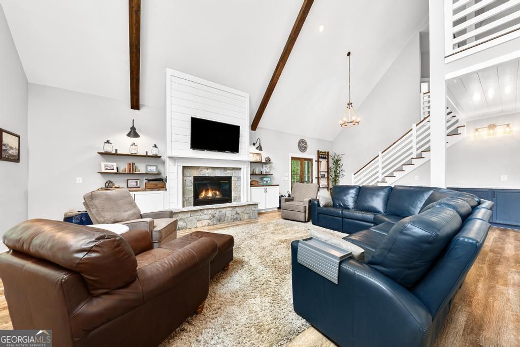 NEVER MISS A SUNSET! Make LAKE Living YOURS with this Southern-style custom-built lake home. SPREAD OUT on over 1.56 acres and 121 feet of CORPS line. MAX-SIZED aluminum/trex DOCK-IN-PLACE featuring two slips- one for the boat and the other for two personal watercrafts- making boating and lake life EASY. Drive up and ESCAPE with plenty of room to park on the circular driveway. CONNECTING is easy with many areas to converse and connect: wrap-around porch, covered back deck, terrace-level patio, fire-pit area, or the terrace-level hot tub. The OPEN plan beckons to ENTERTAIN while offering abundant natural light that glows against the easy maintenance flooring. Beautiful built-ins create thoughtful design, and the stone gas fireplace and floating bookshelves add cottage LUXURY to the interior finish. Easy access MAIN FLOOR PRIMARY SUITE with its own primary suite featuring a large walk-in shower and built-in tub, and a walk-in closet. Two secondary bedrooms, plus an office, grace the upstairs, with a Jack-and-Jill bath. Hang out on the terrace-level great room and PLAY games or watch sporting events with ease, featuring a small kitchenette, a large great room with a roll-up garage door, and endless views of the water. Guests will enjoy PRIVACY and SPACE during their stay, with an additional two bedrooms and a bath on the terrace level. The OPEN kitchen is designed for CULINARY artists, featuring plenty of custom cabinets, stainless appliances, a walk-in pantry, an oversized island, and countertop space for the cook. YOU will love the eat-in dining space, roomy for family gatherings. DREAMY laundry/MUDROOM room features tons of space to organize. ENJOY sunrise/sunset on the covered back deck. RETREAT to the backyard, featuring a GENTLE STROLL to the lake. HOBBYIST, you will not be disappointed with the space in the outdoor shed to create and build your newest design. Home is located in a lakeside community with easy access to Toccoa and I-85.