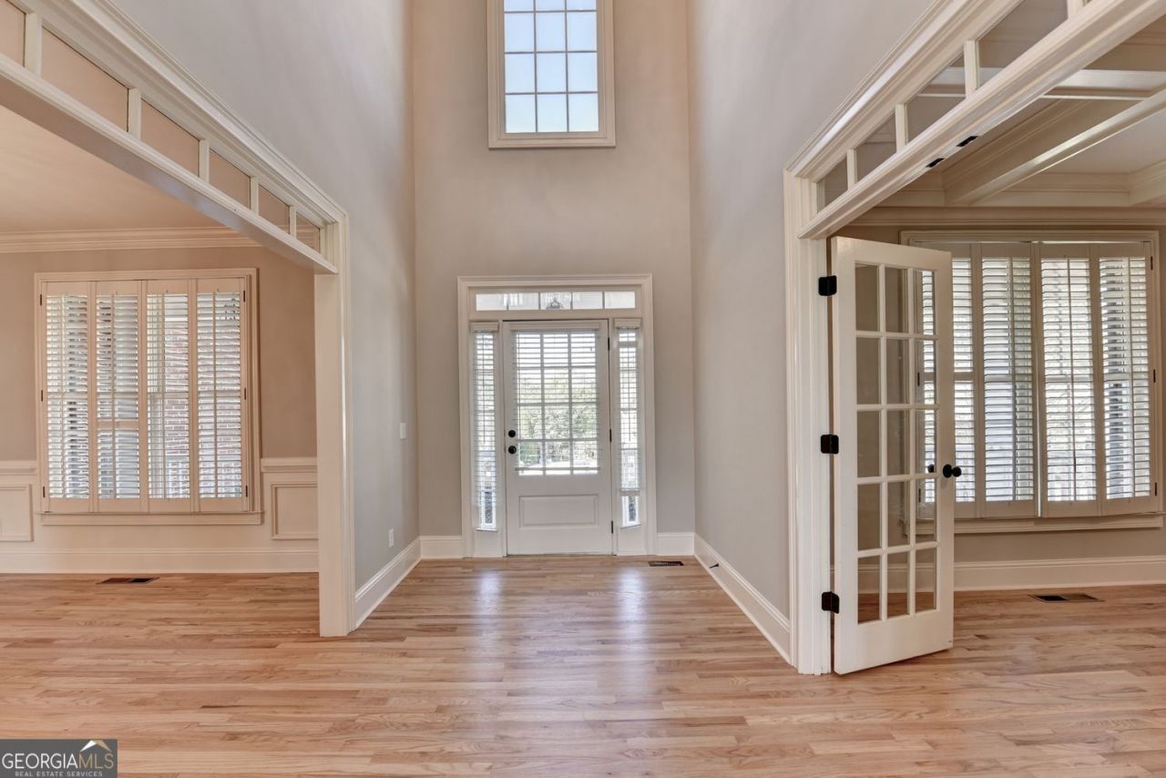 Fabulous Hamilton Mill home tucked away on a quiet cul-de-sac featuring a huge fenced backyard, oversized 3-car garage, and additional parking pad. The inviting front porch is perfect for relaxing and enjoying sunset views. This move-in ready home features newly finished natural hardwood floors, new carpet, fresh interior paint, and a newly sodded backyard. Inside, the dramatic two-story family room showcases expansive windows and is open to the kitchen, creating a bright and welcoming living space. The kitchen is well equipped with a gourmet stove with warming shelf, double ovens, and a walk-in pantry. A private library or office is located just off the foyer. Upstairs, the spacious primary suite features an enormous walk-in closet, and each additional bedroom includes its own walk-in closet. A third level spacious finished flex room with windows adds many possibilities. The finished basement offers exceptional flexibility with a bedroom, full bath, media room, and plenty of storage-ideal for guests, entertaining, or multi-generational living. Enjoy outdoor living on the large deck overlooking the expansive fenced backyard.