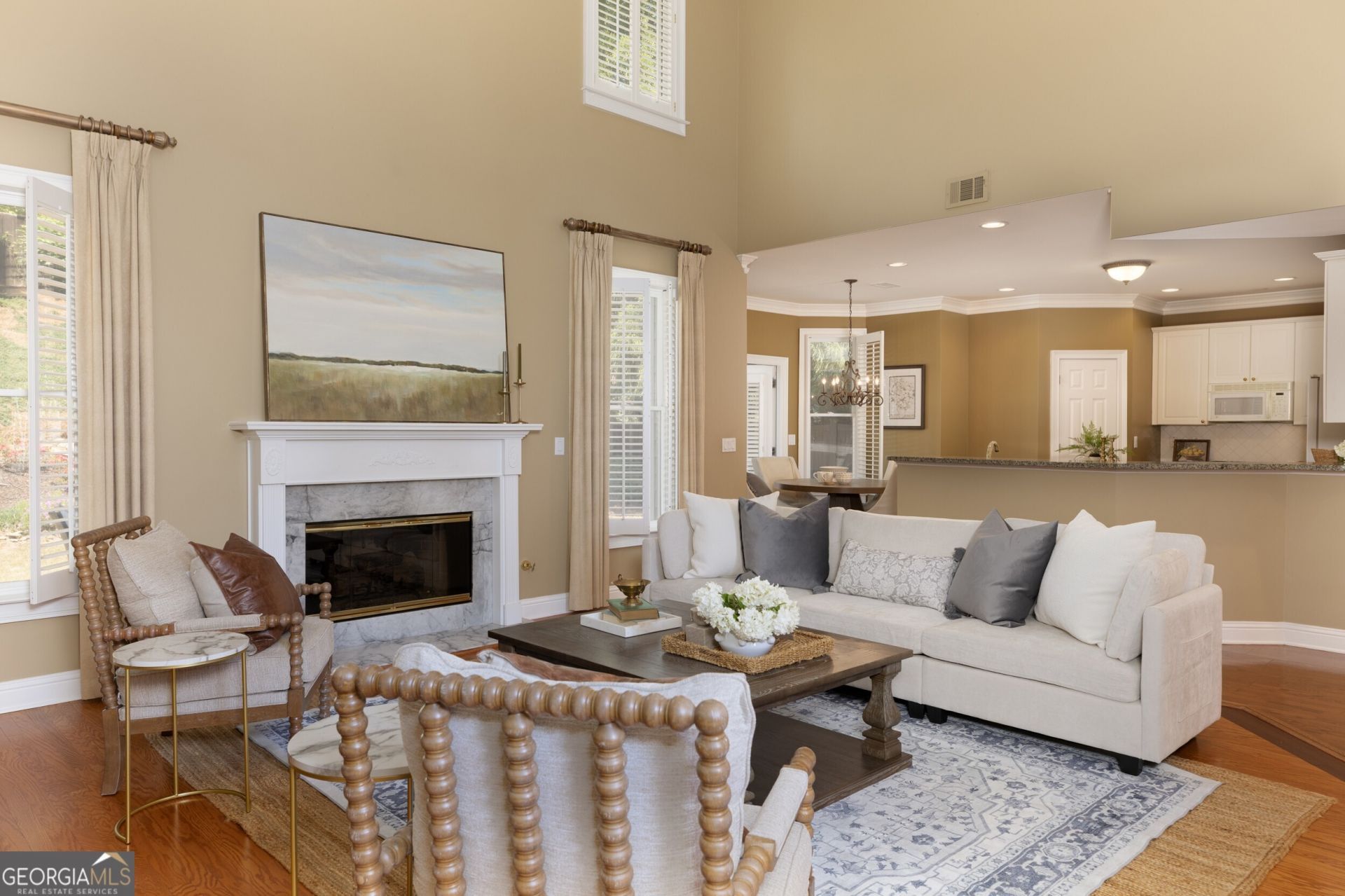 Located in a well-established, highly desirable neighborhood within top-rated schools, this beautifully maintained home offers exceptional curb appeal and a timeless design. Featuring a sought-after master on main, the spacious owner's suite is privately situated and designed as a true retreat, complete with tray ceilings, French doors, and a spa-inspired bath featuring a soaking tub with serene backyard views and generous his-and-hers closets. Perfectly situated on a professionally landscaped .25-acre corner lot, this three-sided brick home offers 3,161 square feet of thoughtfully designed living space in a quiet, established community featuring sidewalks and a strong sense of neighborhood charm. A side-entry oversized two-car garage and low-maintenance yard with an irrigation system further enhance the home's ease of living. The main level showcases an elegant open-concept layout filled with natural light, plantation shutters throughout, and refined architectural details. Designed for both entertaining and everyday living, it includes a formal dining room with wainscoting, a warm gas fireplace, and a breakfast nook that opens seamlessly to the outdoor patio. A striking staircase overlooks the great room, adding architectural interest and openness to the main living space. One of the home's most distinctive features is the turret-style room an elegant and versatile space ideal for a private office, sitting room, or reading retreat. Upstairs, a spacious loft area offers custom built-ins for media, a dedicated desk space, and a bright secondary living area perfect for work or relaxation. Three generously sized secondary bedrooms complete the upper level, two of which feature private en-suite baths. The fourth bedroom is exceptionally large with custom built-ins and a spacious closet, making it ideal as a playroom, media room, or flexible bonus space. Recent mechanical updates including a newer HVAC system and newer hot water heater provide added peace of mind and efficiency for the next owner. Ideally located near the best of East Cobb and Roswell, this residence offers a seamless blend of refined comfort, thoughtful updates, and enduring value.