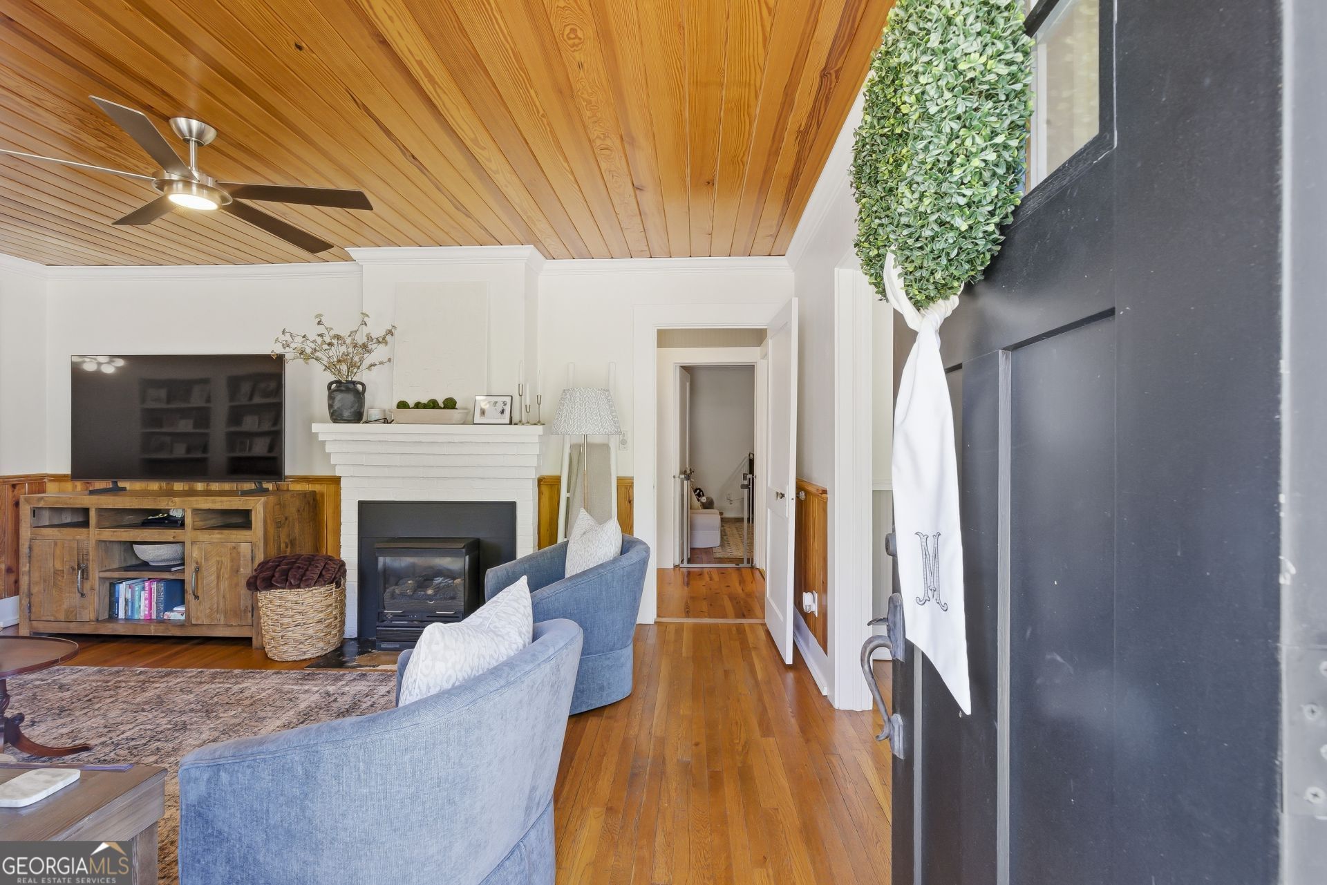 DOWNTOWN living at its finest....Nestled in the heart of Carrollton- all within walking distance to downtown shops, dining, and events! Step inside to find a warm, inviting living room featuring a stunning tongue-and-groove ceiling and brick gas fireplace, creating a custom feel. Just off the living area, a versatile inset space with beadboard custom shelving makes the perfect playroom, home office, or reading nook. A beautifully defined dining room-also accented with tongue-and-groove ceilings-perfect for hosting holidays and gatherings. The kitchen offers a cozy, inviting feel with granite countertops, stainless steel appliances, and pantry. A door off the kitchen leads directly to the outdoor space. The oversized primary suite offers a walk-in closet and a tiled shower. The large laundry room is a functional space, with cabinetry, a wash sink, and a trendy accent wall. Upstairs, you'll find an additional room with a closet and half bath-ideal for guests or a teen suite. Enjoy updates and modern finishes throughout the home. Storage is truly abundant both inside and out, including an unfinished basement perfect for extra storage. Outside, enjoy a newly sodded, fenced-in backyard designed for privacy and ideal for entertaining, cookouts, or simply relaxing. A detached shop provides the perfect space for hobbies or additional storage needs. Parking is no issue with a two-car garage plus a two-car drive-under carport. This home beautifully preserves its historic charm while offering the updates and functionality today's buyers love-don't miss your chance to own a piece of downtown Carrollton!