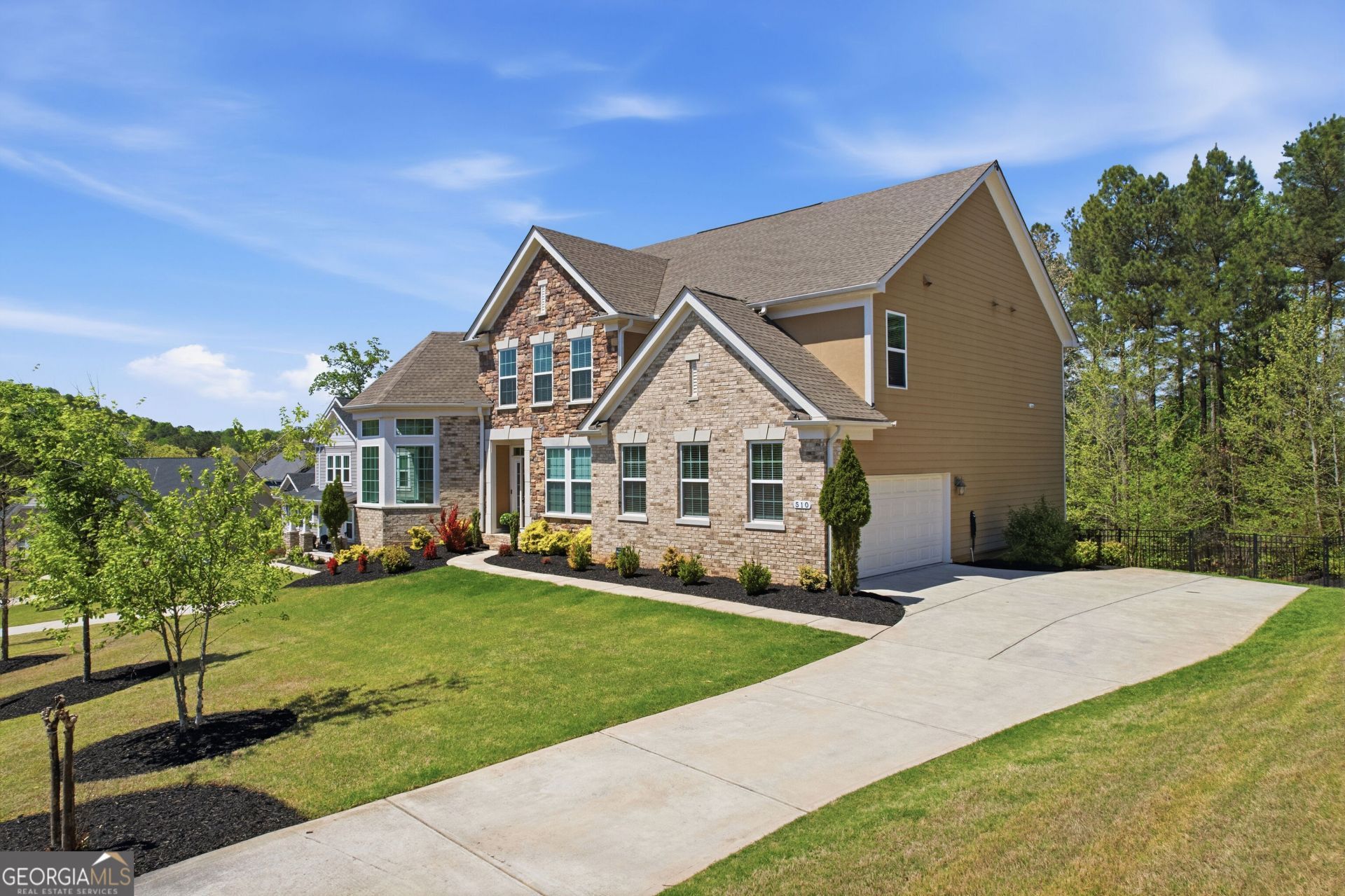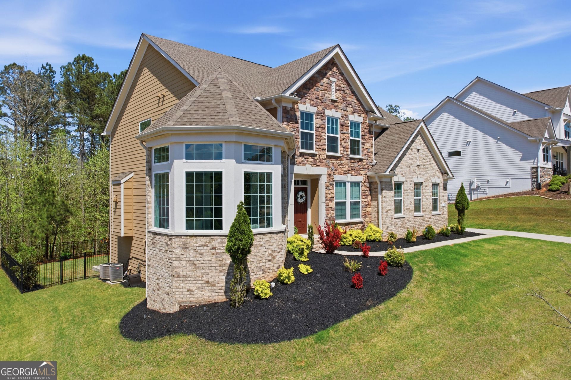 Nestled on a quiet cul-de-sac and surrounded by the natural beauty of the Etowah River, this exceptional home backs to protected greenspace, offering the perfect blend of privacy and scenic tranquility. Showcasing a stately brick and stone facade, the residence welcomes you with a light-filled interior and thoughtfully designed living spaces. Inside, elegant details abound-from the private sitting room with panoramic bay windows to the spacious formal dining room ideal for entertaining. The gourmet kitchen is a true centerpiece, featuring a large island, designer lighting, stainless steel appliances, and seamless access to the grilling deck. The open-concept layout flows effortlessly into the fireside great room, while a dedicated home office, walk-in pantry, mudroom, and custom laundry room complete the main level. Upstairs, the luxurious primary suite serves as a serene retreat, highlighted by a cozy sitting area with a double-sided fireplace and a spa-inspired bath with dual vanities, soaking tub, tiled shower, and generous walk-in closets. Three additional bedrooms offer en-suite or shared bath access, providing comfort and flexibility for family or guests. The largely-finished terrace level adds even more living space with a media/rec room, full bath, and opportunity for future expansion. Outdoor living features a covered patio with hot deck, grilling deck and beautifully landscaped and fenced yard. The oversized two-car garage includes an EV charging station for modern convenience. Located in Governors Preserve, an 862-acre conservation community recognized by the National Wildlife Federation, residents enjoy direct access to approximately 3.5 miles of the Etowah River, along with breathtaking views of mountains, creeks, and preserved natural surroundings. Resort-style amenities include a pool with an 87-foot waterslide, tennis courts, basketball courts, playground, clubhouse, and over 7 miles of scenic hiking trails. Zoned for top-rated Cherokee County schools-Avery Elementary, Creekland Middle, and Creekview High-this home offers both lifestyle and location. Why pay for new construction when you can own this better-than-new 2021 home, already upgraded and move-in ready?