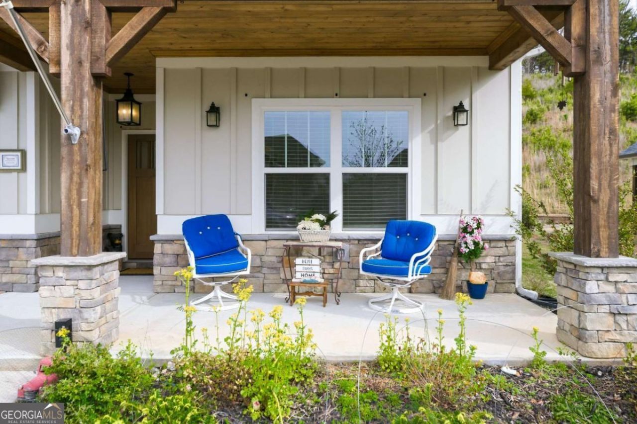 Welcome to this charming Craftsman style home nestled on a quiet cul de sac lot in Lake Arrowhead, perfetly nestled in the foothills of the North Georgia mountains and offering resort style amenities. This beautifully designed residence offers 4 bedrooms and 3 full bathrooms, with a highly desirable layout featuring the primary suite and an additional bedroom on the main level, plus a private upstairs retreat perfect for guests. From the moment you arrive, you'll appreciate the flat driveway leading to a 2 car garage and the inviting covered front porch accented with cedar beams, stone details, and classic shake siding. The home is surrounded by easy to maintain landscaping, making it ideal for low maintenance living. Step inside to a light filled interior showcasing modern LVP wood flooring and neutral paint tones throughout. The open concept design seamlessly connects the family room, kitchen, and dining area making it perfect for everyday living and effortless entertaining. The family room features a cozy stone fireplace with floating wood shelving, creating a warm and welcoming focal point. The adjacent kitchen is both stylish and functional, offering beautiful wood cabinetry, stainless steel appliances, granite countertops, tile backsplash, a pantry, and a center island with breakfast bar seating. The dining area completes the space and provides lovely views of the backyard. The main level primary suite is a relaxing retreat, complete with a spacious bedroom and a luxurious en suite bath featuring double vanity sinks, granite counters, a tile shower, and a custom walk in closet. A secondary bedroom and full bath with a tub/shower combo are also conveniently located on the main floor, along with the laundry room for your convenience. Upstairs, you'll find a versatile loft space ideal for a home office, playroom, or secondary living area as well as 2 additional bedrooms and a full bath, offering comfort and flexibility for family or visitors. Additional storage is available in the unfinished attic, with potential to expand into additional living space if desired. Outdoor living is just as impressive, with a covered front porch perfect for relaxing and a covered back patio designed for entertaining. Enjoy peaceful evenings overlooking the terraced backyard, lined with trees and mountain frontage for serene views of nature. The outdoor space also features a hot tub and outdoor kitchen, making it an ideal setting to unwind or host gatherings. This home includes a Generac Full House Generator for added convenience. This home truly offers the perfect blend of comfort, style, and functionality in a tranquil setting. Residents enjoy one of North Georgia's most desirable neighborhoods with 5 Star resort style amenities including a 540 acre lake with marina, championship golf course, clubhouse with dining, two pools, tennis and pickleball courts, hiking trails, parks, and year round activities, all within a gated community of Lake Arrowhead.