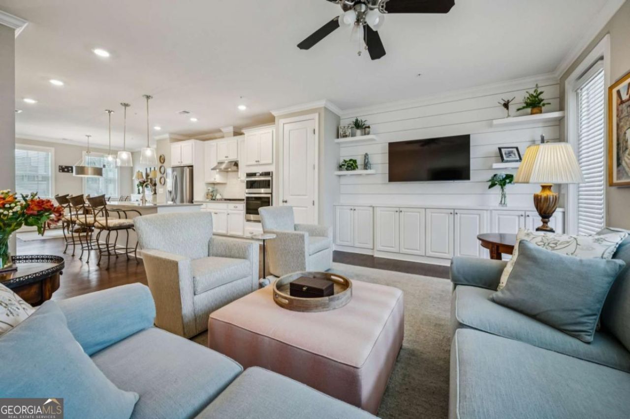 Beyond exceptional ARIA, the coveted Sandy Springs residential destination with lofts, various sized townhomes and detached single family homes up to $1,400,000. Strategically located minutes from Mercedes Benz National Headquarters, GA 400, and the Sandy Springs MARTA system, along with pedestrian friendly restaurants, retail, and conveniences. This one owner home is brimming with unique upgrades! The shiplap accent wall with 4 floating shelves and custom cabinetry gives prominence to the family room. The terrace level bedroom, currently used as a home office, has a custom-built-in unit with a full wall of bookcases and shelving system. The guest bedroom offers a charming custom built-in window seat with cushions, and additional storage cabinets below. The seller added a tray ceiling, a shower tile seat and frameless shower door and a custom closet system with built in cabinets and shelving to the owners' suite. The kitchen is upgraded with white cabinets, Silestone quartz counters and island, designer back splash, an upgraded faucet, upgraded Whirlpool appliances and a Kohler Whitehaven farm sink with tall apron. Added built-in shelves and a closet organizer to the secondary bedroom upstairs and built-in shelves and hanging space to the laundry room increases storage efficiency! This floorplan, the Archer, has the master bedroom facing the back of the townhome. Hardwood flooring throughout, except in 2 bedrooms, upgraded light fixtures, upgraded paint throughout and an ample sized 2 car garage with built in storage complete this quality and personalized townhome! Come home from a busy day at work and relax on the serene covered deck off the great room, stroll the luxurious winding green spaces at Aria, take a dip in the pool, or do a workout in the fitness center located in the handsome clubhouse. Please do not use Showingtime or text for appointments.