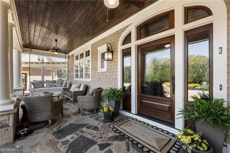 Discover a rare opportunity to own a private, gated estate in one of Cherokee County's most coveted areas-just minutes from the Milton border, top-rated schools, the Crabapple District, and vibrant downtown Alpharetta. Set on 2.78 manicured acres, this custom-built 2012 Southern retreat blends timeless rustic elegance with modern luxury, offering an unmatched lifestyle of privacy, comfort, and refined living. A long, tree-lined gated driveway leads to the welcoming covered front porch, complete with a classic porch swing that sets the tone for the warmth and character found throughout the home. Inside, the main level is designed for effortless everyday living, featuring a rare primary suite on the main and a beautifully curated floor plan filled with natural light. At the heart of the home, the gourmet kitchen impresses with stone countertops, a Wolf range, farmhouse sink overlooking the backyard, a spacious island with secondary prep sink, walk-in country pantry, a butler's pantry/coffee-breakfast-wine bar, and light-filled dining room. The fireside great room has full access to a vaulted covered patio with an outdoor fireplace and full outdoor kitchen-perfect for year-round entertaining and overlooking the PebbleTec pool and spa. Upstairs, a central loft with built-in desks and shelving provides an ideal office, homework, or creative workspace. Two generous en-suite bedrooms each offer private baths, ensuring comfort and privacy for family or guests. The terrace level expands the home's versatility with a second family room and fireplace, a guest bedroom with full bath, a separate half bath, and a flexible workout or gaming room. A spacious main-level laundry and mudroom connect via a covered stone walkway to the oversized three-car garage. Above the garage, a full in-law or guest suite offers a private living area, kitchenette, sleeping area, and full bath-perfect for extended stays. Outdoors, the property truly shines. The flat, usable acreage is fully fenced and thoughtfully landscaped, offering open green space, multiple garden areas-including a charming pumpkin patch-and a barn with power for hobby farming, storage, or future customization. The dedicated pool bath off the garage is an added convenience as well. High-quality craftsmanship, and a setting that feels worlds away yet close to everything, this estate delivers a polished, effortless take on luxury countryside living. A true Southern Charmer!