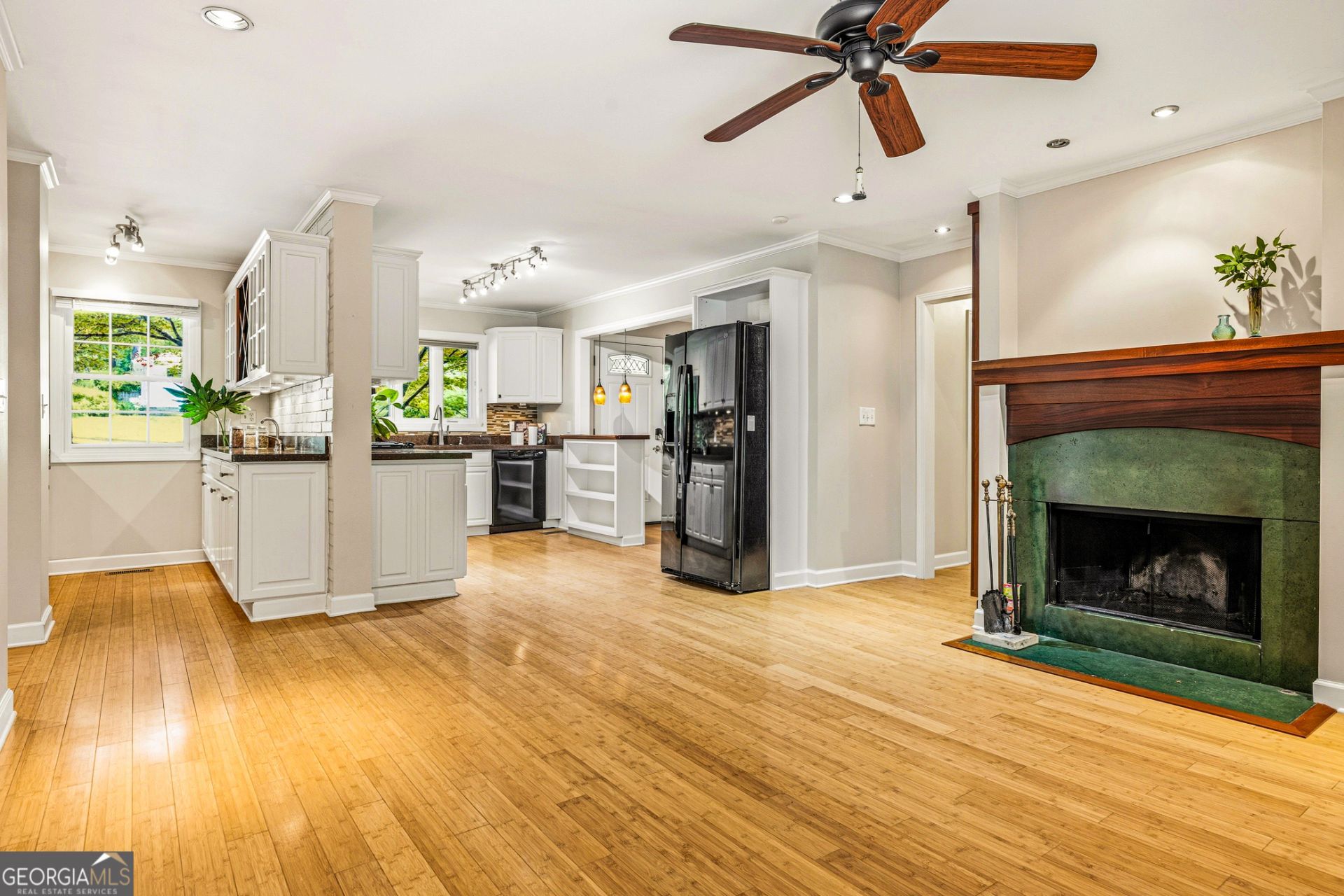 734 Cool Hollow Drive offers a peaceful retreat and many novel features that merit a key stop in your search for the perfect home in central DeKalb County. The 3 BR, 2 BA home with 2,146 (appraiser measured) SF of heated and cooled space is primarily brick, with bamboo floors throughout the main level. The house on an almost half acre corner lot was lovingly expanded and improved by the past two owners, including a large master suite, a sunny bedroom with built-in murphy bed, and the gorgeous all-weather porch that overlooks the backyard and bordering woods. The master bedroom easily fits a king-size bed plus additional furnishings, and the remaining bedrooms are just right for children or other uses like a guest room or office. The living room/kitchen area is designed as open plan. The kitchen and adjacent butler's kitchen offer generous counter space for meal preparation and roomy cabinets (many with built-in drawers). Meals can be served in the full-size dining room or more casually on the rear porch. The living room fits a sectional couch with other furniture, and the fireplace with gas starter generously warms the room on cold nights. The porch with its rustic and natural design is also a gathering area for family and guests with many screened windows that offer beautiful views of unbuildable woods. Out the porch door is a deck for sitting/grilling. Steps go down to the backyard where the large grassy area is perfect for families and/or pets to run, play or visit with friends. The garden sections are ready for plantings of vegetables, fruits and flowers. Just inside the basement door is a finished multi-purpose room that can accommodate office space, exercise equipment, rec room, and/or an extra sleeping area (thanks to the built-in murphy bed). In the rear is plentiful storage, plus a separate workroom with a Coleman workbench that will convey. The high-quality waterproofing installed by a previous owner (also a contractor) is evident throughout the basement space.