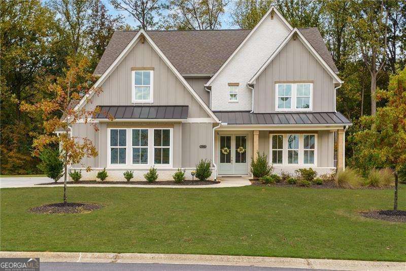 This beautiful home features 5 bedrooms and 4 and a half bathrooms, along with a 3-car side-entry garage. It is situated in the popular Long Hollow Landing community at Lake Lanier, which is served by East Forsyth High School. The large lot is perfect to add a pool. The bright and open-concept floor plan is ideal for both entertaining and relaxing. The spacious great room includes a cozy gas fireplace. The kitchen boasts a large island, a gas cooktop, a built-in oven, a microwave, and a walk-in pantry. On the main floor, there is a guest bedroom with an adjacent full bathroom, as well as a convenient half bathroom. The second-floor owner's suite features vaulted ceilings and a relaxing bathroom, complete with a beautiful frameless shower door, a garden tub, a double vanity, and a large walk-in closet. There are three secondary bedrooms on the second floor, one of which has a private bathroom, while the other two share a Jack and Jill bath. Additional second-floor features include a spacious laundry room, a bonus area, and walk-in attic storage. Other highlights of the home include wood flooring, wood stair treads, large lot backing to trees, and an irrigation system. Community amenities encompass an outdoor gathering area with a covered pavilion, a fireplace, restrooms, access to Lake Lanier, and a community swimming and fishing platform located at the end of two docks.