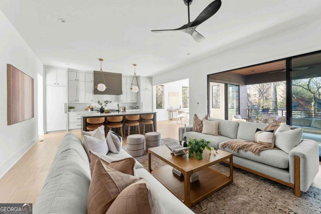 Set in one of Atlanta's most beloved neighborhoods, 864 Amsterdam Avenue introduces a new standard for modern living, where thoughtful architecture, refined materials, and an unmatched intown lifestyle come together in a way rarely seen in the city. Morningside is cherished for its tree-lined streets, strong sense of community and timeless character, offering a seamless blend of neighborhood charm and urban convenience. A striking steel pivot front door, both sculptural and functional, opens to a light filled interior defined by clean lines, warm organic touches and an elevated modern aesthetic. Subtle curved radius walls add architectural softness to the entry foyer, while expansive windows bring in natural light throughout. Pre-finished European white oak floors and a soft, neutral palette create a sense of calm and continuity. Designed for both everyday living and elevated entertaining, the main level features an open concept between the living room, dining area and kitchen. A beautifully appointed kitchen showcases honed Calacatta Vietri countertops, custom cabinetry by Kitchen and Bath Design Group and a Monogram appliance package, all complemented by a large butler's pantry that adds both function and storage. Layered lighting from Visual Comfort, Hudson Valley and Ferguson Home enhances the space, while a Portola Roman Clay fireplace adds texture and a refined focal point to the family room. What truly sets this home apart is its seamless connection to the outdoors and the wealth of outdoor living space that expands its overall livability. With over 2,000 square feet of outdoor living space, including two rear decks, a front porch and an expansive rooftop terrace, the home offers a lifestyle rarely found in this location. Arguably the largest rooftop terrace in the neigborhood, spanning approximately 1,200 square feet, is designed for both intimate gatherings and larger scale entertaining, all framed by sweeping skyline views. An Infratech heater on the back porch allows for year round enjoyment, further extending the living space outdoors. A main level bedroom with floor-to-ceiling windows, a private front terrace and a full bath provides flexibility for guests or a home office. Upstairs, the primary suite offers a quiet retreat with a spa-inspired bath featuring a custom walnut vanity, generously sized shower and soaking tub and elevated finishes, along with expansive dual closets with custom closet systems. Each additional bedroom includes an attached en-suite bath, offering comfort and privacy, while a conveniently located laundry room completes the upper level. On the lower level, a finished basement adds versatility for a media room, fitness space, or additional living area, enhancing both functionality and everyday livability. All of this is set within a neighborhood known for its strong sense of community and access to some of Atlanta's most loved destinations. Just moments away, Virginia Highland offers a vibrant mix of local restaurants, coffee shops, boutiques, and everyday conveniences. Whether it's morning coffee, dinner with friends, weekend brunch, or an evening stroll, the lifestyle here is both effortless and connected. At 864 Amsterdam Avenue, you're not just buying a home, you're stepping into a lifestyle defined by thoughtful design, exceptional outdoor living, and one of the city's most sought-after locations.