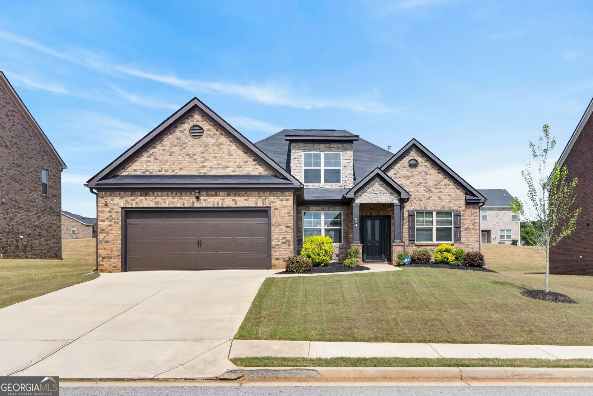 Step into this stunning, sun-drenched 4-sided brick beauty, built in 2022 and designed for both luxury and comfort! Featuring a highly sought-after owners suite on the main level, this home offers a spacious private suite complete with a spa-inspired bath, separate garden tub and shower, and an oversized walk-in closet with custom shelving and linen access. The heart of the home is a true showstopper, gourmet kitchen equipped with sleek granite countertops, abundant cabinetry, an inviting breakfast area, and a stainless-steel gas cooktop paired with double ovens, perfect for entertaining or everyday living. The open-concept layout flows seamlessly into the family room, highlighted by a cozy gas fireplace and filled with natural light from the home's beautiful southwest exposure. Enjoy the elegance of hardwood floors throughout the entire main level, including all bedrooms and living spaces. The kitchen and bathrooms have travertine tile, an exceptional upgrade that elevates the home's style and durability. Upstairs, you'll find a versatile loft space ideal for a home office or media area, along with a private secondary bedroom featuring its own en-suite bath. Two additional bedrooms and a full bathroom complete the upper level, offering flexibility for guests or family living. This home is thoughtfully designed with modern conveniences, including a dual system thermostat for optimal comfort, pre-wiring for ADT cameras and security sensors, storm doors on both front and rear entries, and an expansive dining room perfect for gatherings. Outside, relax on the back patio overlooking a serene, open green space, while the two-car garage and extended driveway provide ample parking. Ideally located with quick access to I-75 and nearby shopping, this home truly combines style, space, and convenience. This is the one you've been waiting for-schedule your showing today!
