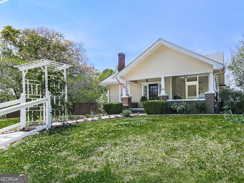 Historic 1920's Craftsman style 3 bed, 2 bath home on 1 acre within walking distance to beautiful downtown Ball Ground. This home has been updated without disturbing its historic charm. Notice the white, marble steps and capstones on the front of the house. Enter the home through an elegant French door into the large parlor with original heart-pine floors, crown molding, elegant brick fireplace w/gas logs, and 9 ft ceilings. From here, double French doors lead to the screened porch. (This home has 3 porches). Continue into the oversized dining room with large bay window, crown molding, and built-in bookcases. The kitchen has been updated with stainless steel appliances, current lighting, granite counter tops, updated cabinets, pantry, and has its original heart-pine floors, walls, and ceiling. The Master on main is oversized with lots of natural light, crown molding and picture frame molding. The Master opens to an oversized bath that has been remodeled with a double vanity that has a granite counter top, updated plumbing fixtures, current lighting, and a large garden tub. The guest bath down the hall has also been remodeled with new vanity, quartz counter top, current lighting, and plumbing fixtures. There's a large laundry room that could be used for office, exercise, or bonus room. Step from here onto the large, raised patio with brick railing that overlooks the fenced yard with fruit and nut trees. The stairs from the front parlor lead to the large upper bedroom that would be a great separate space for a teen. This home has its original door hardware with glass doorknobs, classic 3 over 1 windows, and all heart pine floors. The HVAC was replaced in 2025, electrical and plumbing updated in 2016, and spray foam attic insulation in 2024. Basement/crawlspace has plenty of room for workbench, lots of storage, and was encapsulated in 2024. Downtown Ball Ground has recently come to life with great shops, restaurants, park, walking trails, activities, and festivals all with quick access to the interstate for ease of commute. You'll love this home!